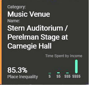 One example: The Stern Auditorium at Carnegie Hall in Manhattan carries an 85.3 percent “place inequality” rating. The overwhelming share of the visitors to this venue come from the Atlas of Inequality’s highest income level.