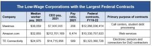 Pdf version includes a table listing the 74 low-wage corporate contractors, their CEO pay, pay ratio, federal contracts, and stock buybacks.
