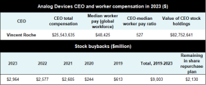 U.S. chipmaker Analog Devices is reportedly seeking federal CHIPS subsidies and has already received financial support from the Oregon government to expand a factory in that state. Like many others in the industry, Analog has a history of massive spending on stock buybacks and executive pay. CEO Vincent Roche made $25.5 million in 2023 – 527 times as much as pay for the firm’s median worker. During the 2019-2023 period, the chipmaker spent $9.5 billion on stock buybacks and has more than $2 billion remaining in their board-authorized repurchase program.