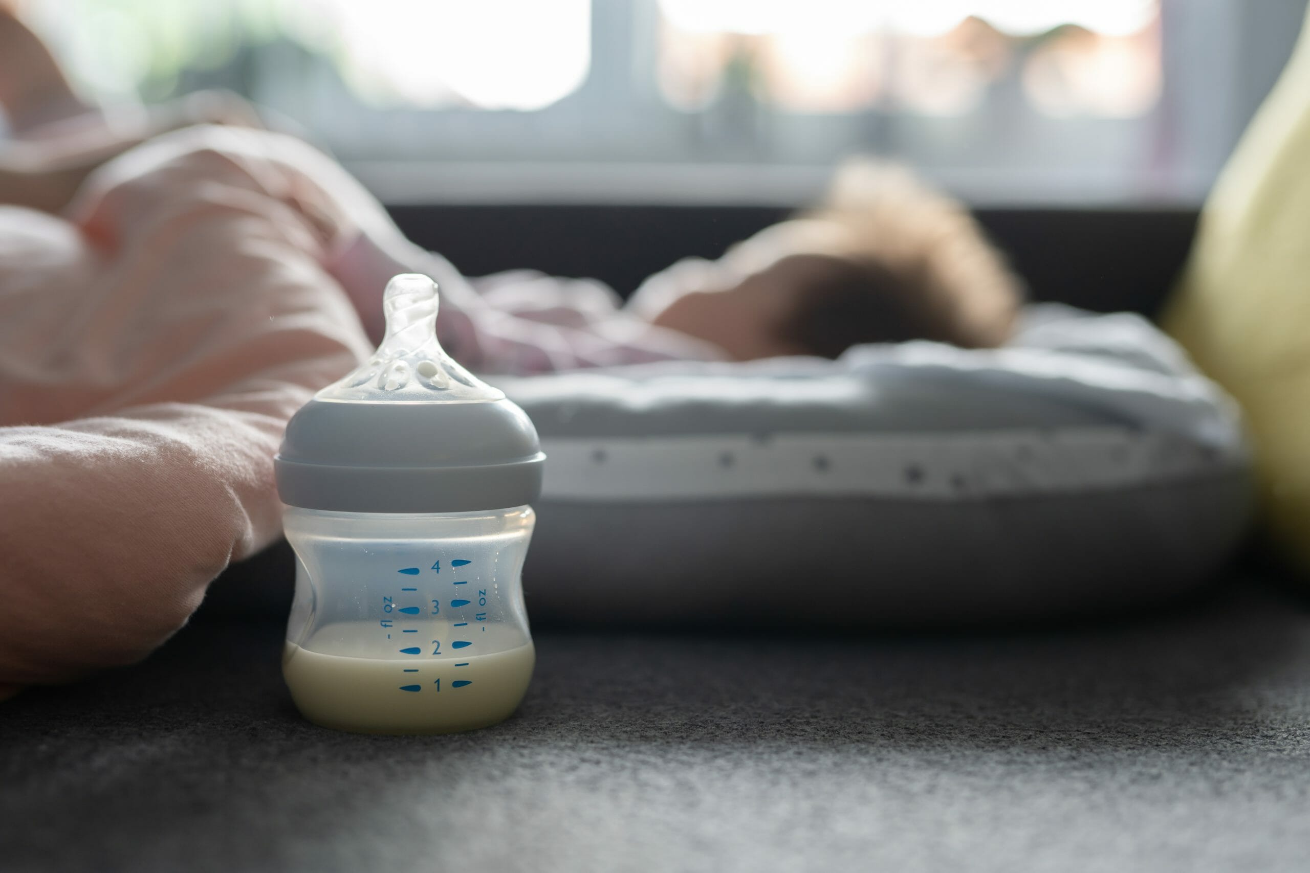 Close up selective focus on breast or formula milk in the baby bottle on the bed at home with sleeping baby infant in background - newborn feeding and nursing concept concept copy space