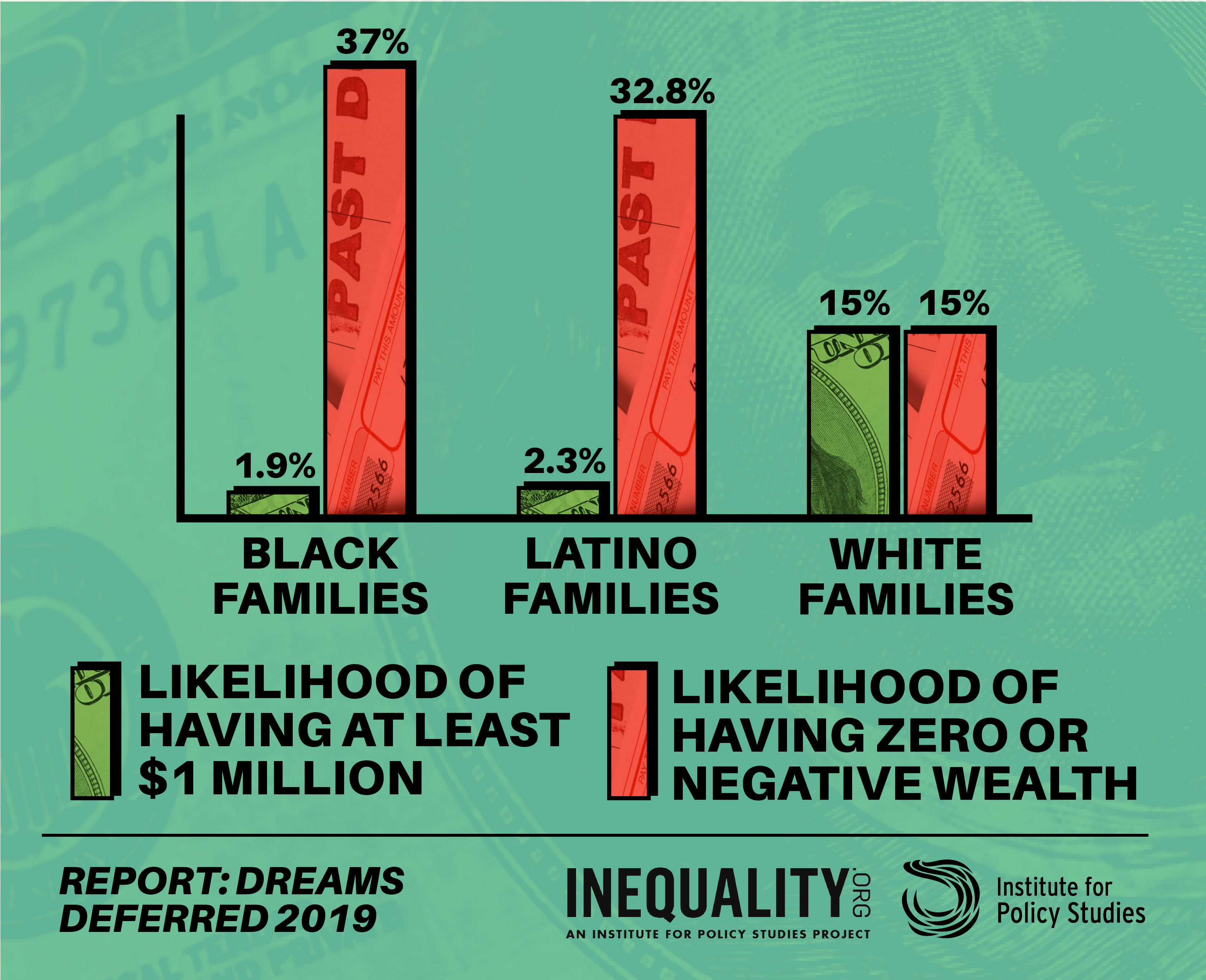 - Black families are about 20 times more likely to have zero or negative wealth (37 percent) than they are to have $1 million or more in assets (1.9 percent). Latino families are 14 times more likely to have zero or negative wealth (32.8 percent) than they are to reach the millionaire threshold (2.3 percent). White families are equally likely to have zero or negative wealth (about 15 percent) as they are to be a millionaire (15 percent).