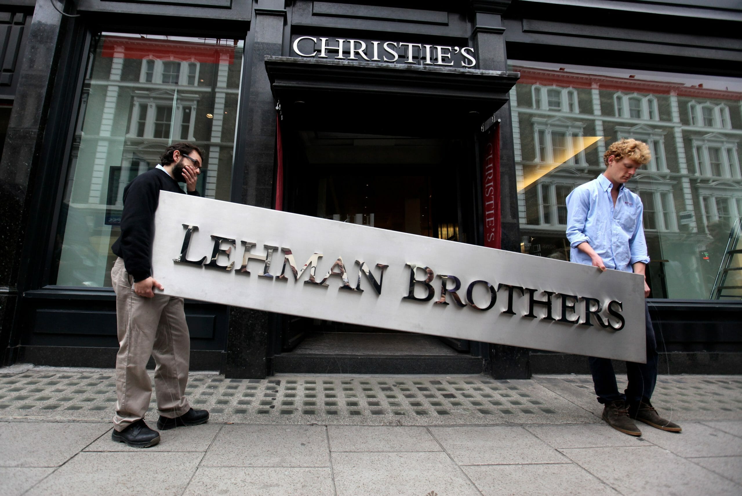 LONDON, ENGLAND - SEPTEMBER 24: Two employees of Christie's auction house manoeuvre the Lehman Brothers corporate logo, which is estimated to sell for 3000 GBP and is featured in the sale of art owned by the collapsed investment bank Lehman Brothers on September 24, 2010 in London, England. The "Lehman Brothers: Artwork and Ephemera" sale will take place on September 29, 2010, on the second anniversary of the firm's bankruptcy, and comprises of artworks which hung on the walls of Lehman Brothers' offices in Europe. (Photo by Oli Scarff/Getty Images)