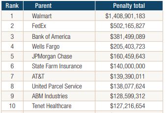 Due to Walmart, retailing is the industry with the highest aggregate penalties ($2.7 billion) imposed on large companies. It is followed by financial services ($1.4 billion), freight and logistics ($828 million), business services ($611 million), insurance ($557 million), miscellaneous services ($486 million), healthcare services ($417 million), restaurants and foodservice ($397 million), information technology ($335 million), and food and beverage products ($315 million).
