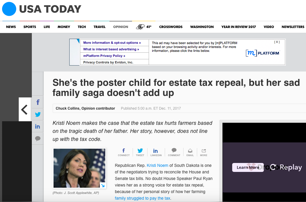 As I wrote in today’s USA Today, Noem is the poster child for estate tax repeal, perpetuating the myth that the estate tax hurts farmers. She serves to distract the public from the real beneficiaries of estate tax repeal—multimillionaires and billionaires.