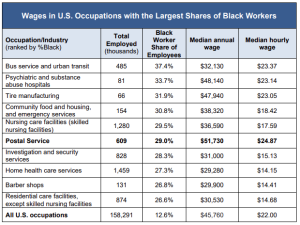 Three of these 10 occupations have median hourly wages below $15 per hour. Of the 10 occupations with the largest shares of Black workers, USPS was the fifth-largest employer, with more than 600,000 employees.