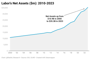 Why isn’t this happening, given the upsurge in worker interest in unions? It isn’t a funding issue, as labor has over $35 billion in net assets (see below). My take is that the existing labor leadership — many of whom have never committed to a robust organizing program to begin with — continue to believe that organizing is futile unless labor law is reformed. This entrenched belief is held even though unions are winning three-quarters of union elections under Biden’s revamped NLRB.