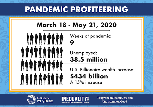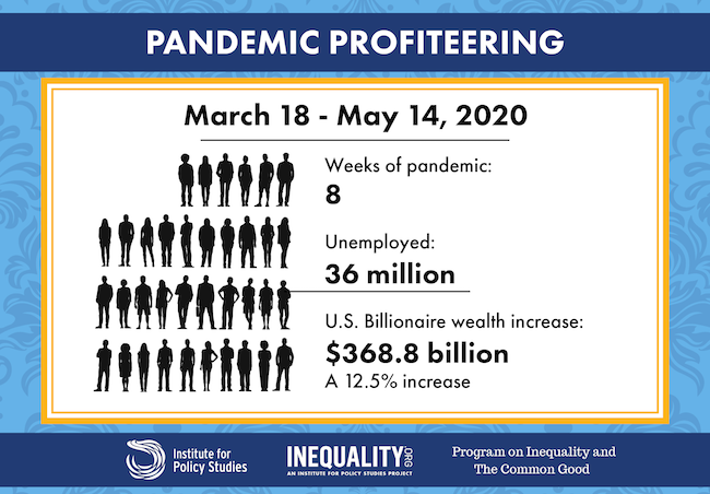Between March 18 and April 30, 2020, over 30 million U.S. workers lost their jobs. Over these same weeks, U.S. billionaires saw their wealth increase $406 billion, an increase in 13.8 percent increase.