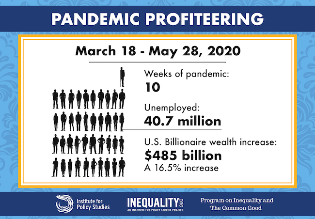 Prior to the pandemic, the Institute for Policy Studies was already exposing the growth of billionaire wealth and the impact on our society and democracy. Our Billionaire Bonanza 2020 report struck a nerve around the world with over 200 media stories in U.S. and global press. See the full report, Billionaire Bonanza 2020: Wealth Windfalls, Tumbling Taxes, and Pandemic Profiteers