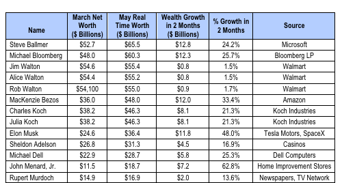Even with a decline in markets, Elon Musk’s wealth increased $3.5 billion in the last week, since May 6. Jeff Bezos’ wealth increased by $900 million and Eric Yuan saw his wealth increase by $800 million. Mike Bloomberg saw his wealth increase by $400 million.
