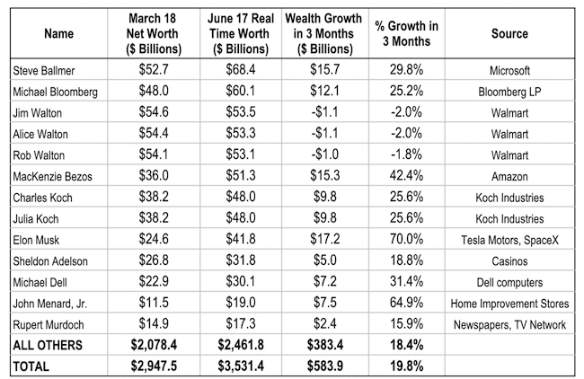 Between March 18 and June 11, the cumulative total wealth of U.S. billionaires has increased $637 billion, an increase of 21.5 percent. Over 630 billionaires have a combined wealth of $3.584 trillion dollars.