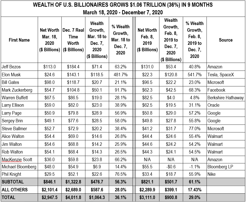 The collective wealth of all U.S. billionaires has increased over $1.1 trillion since mid-March 2020, a nearly 40% leap during the past 10 months of national emergency.