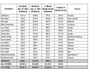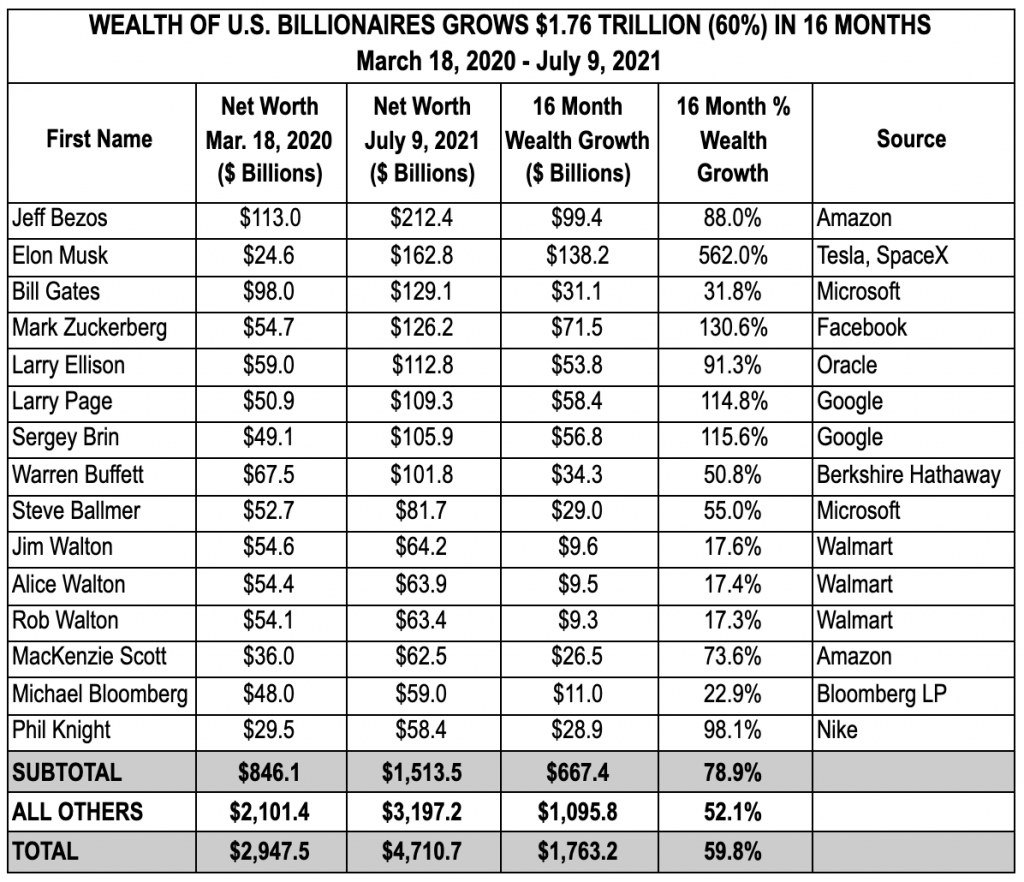 Over the last 16 months, since the formal beginning of the pandemic lockdown, the combined wealth of 713 U.S. billionaires has surged by $1.8 trillion, a gain of almost 60 percent. The total combined wealth of U.S. billionaires increased from $2.9 trillion on March 18, 2020 to $4.7 trillion on July 9, 2021.