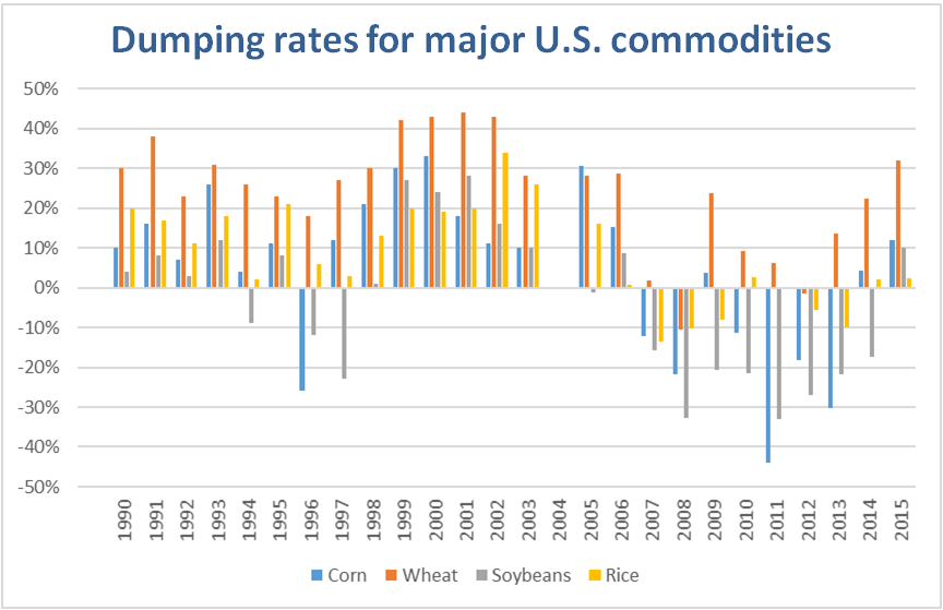 The Institute for Agriculture and Trade Policy (IATP) has used World Trade Organization formulas to document the systematic dumping of U.S. grown agricultural commodities (specifically wheat, soybeans, corn, cotton, and rice) for two decades. They found that in the wake of the volatile commodity markets that dominated in the period from 2007 to 2013, export prices largely exceeded production costs. In recent years, however, U.S. agricultural commodity dumping has started again. According to IATP’s calculations, in 2015 U.S. wheat was exported at 32 percent less than the cost of production, soybeans at 10 percent less, corn at 12 percent less, and rice at 2 percent less.