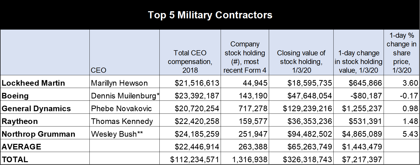 CEOs of major U.S. military contractors stand to reap huge windfalls from the escalation of conflict with Iran. This was evident in the immediate aftermath of the U.S. assassination of a top Iranian military official last week. As soon as the news reached financial markets, these companies’ share prices spiked, inflating the value of their executives’ stock-based pay.
